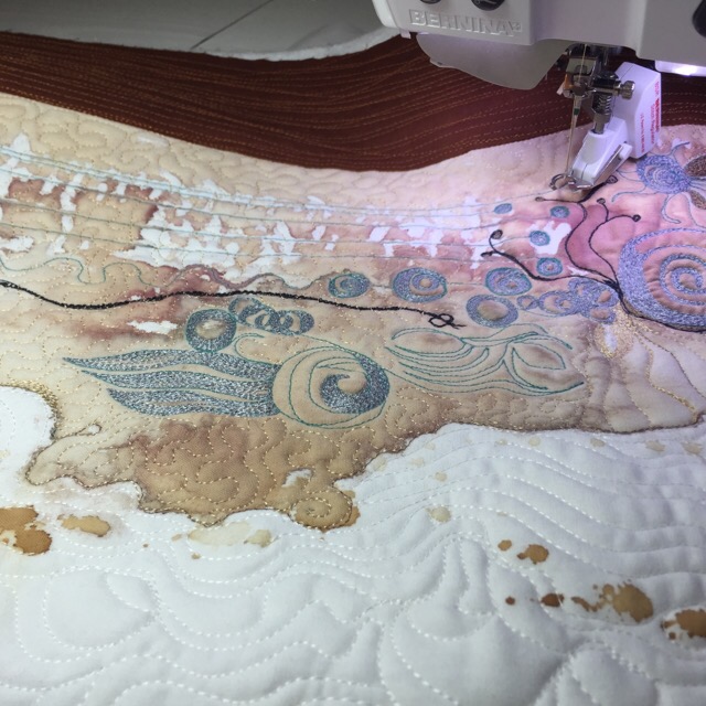 Once the embroidery was completed, the batting and backing attached, the machine quilting is being completed.at the bernina 820top down view at the machineside view show depth of quiltingfront viewup nextcenter completed