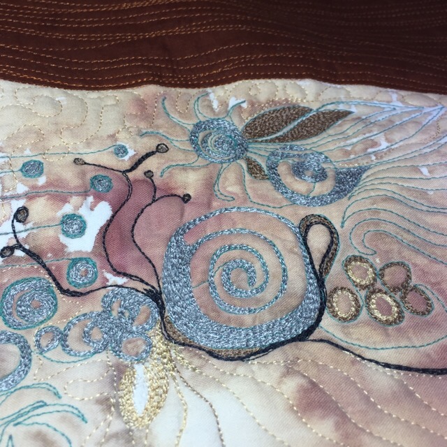 I quilted an overall pattern in a medium teal Metrosene thread and then began to add thread painting with shades of silver, graphite, burnt sienna, gold, black and bronze rayon embroidery threads. I added the top grey and bottom rust sections after the majority of the thread painting was underway.