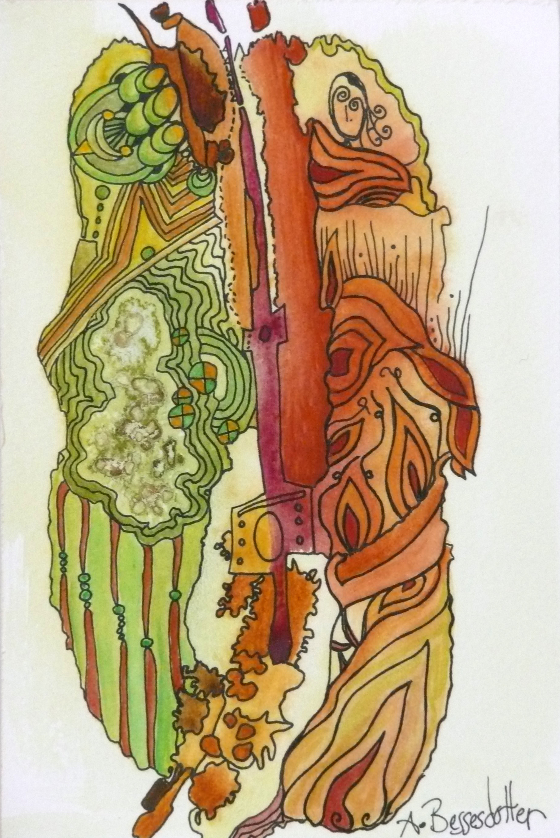 At this point I usually allow the work to dry. Once dry, I can re-wet and add more paint and texture or move on to ink in the large areas. Inking is done with smaller brushes and pens. There is no planning or completion of inking at this time, the piece is open to re-working or starting collage in an inked area or adding paint. The inking is the mind engaging part where I can get lost for hours, allowing ideas to form, transcending the hum-drum-slow-rattle brain chatter and get some peace.