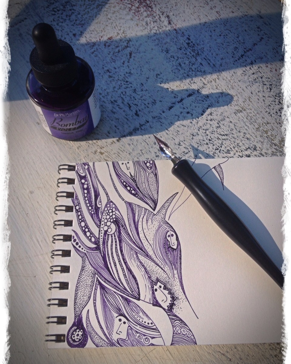 At this point I usually allow the work to dry. Once dry, I can re-wet and add more paint and texture or move on to ink in the large areas. Inking is done with smaller brushes and pens. There is no planning or completion of inking at this time, the piece is open to re-working or starting collage in an inked area or adding paint. The inking is the mind engaging part where I can get lost for hours, allowing ideas to form, transcending the hum-drum-slow-rattle brain chatter and get some peace.
