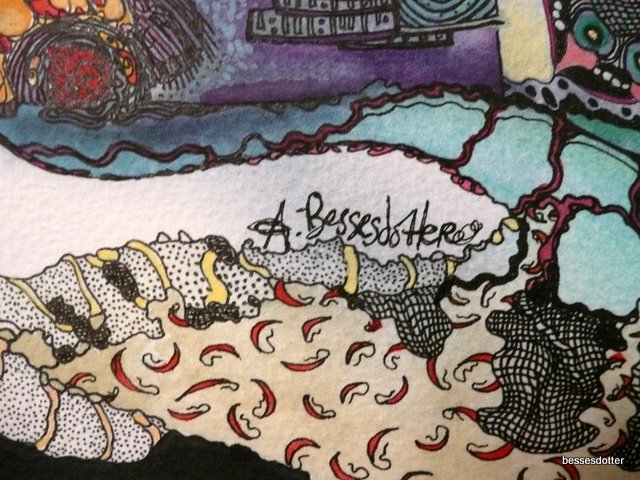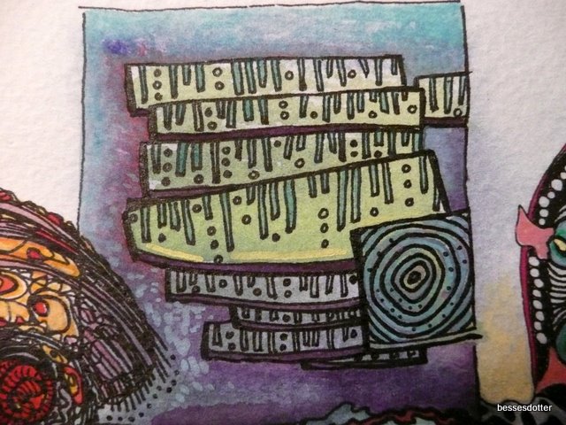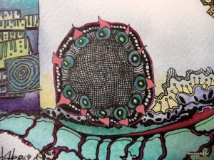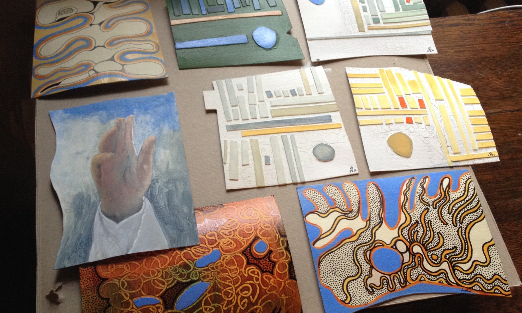 This photo is a picture of my tools and work in front of me. I work at a constant pace on paper and reserve my longer bits of time for larger paintings. The small work gets me through rough patches when time constraints are pushing me to and fro, or space is limited and I am on the go. Much like a knitter takes their work along, I take small paper drawings and pens. This work probably won’t end up in a gallery setting but I make it anyway. I use all my skills to create the best possible work at any given time or using any medium.