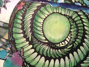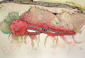 I allow the paint to pool in deep rich colors or pale watery shades. Then I leave. I rest and let my creations solidify. Usually, I sleep and dream about what is brewing on the paper, my dreams are strongly connected to the work at hand. I have contemplated how much my dreams direct the paint but it is speculation. My imagination though is given wings to soar from the dreams which in turn helps the creation move further along. Sometimes, at a point of partial drying I check back and add more pigments, squeezing the drops out of the brush and allowing them to fall, gravity does the work. Although I often work in series, every piece has its own method, its own manner of coming into being even though they are pointed simultaneously. They are living creatures that continue to thrive under my guidance. It is an intuitive process. I feel connected to the work and allow the paintings to emerge–letting the melange of images come forward and speak out. But its only the beginning. They need time, to flower, to open: to be interpreted further. After all the paintings are dry they are stacked and weighed to keep them flat until I am ready to proceed with adding ink. In Part 2 I will discuss the next layer – Inkwork.